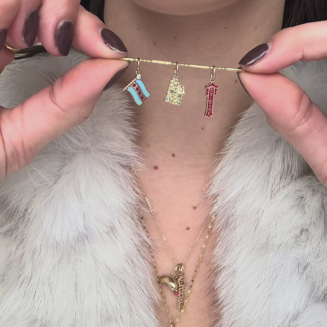 A love letter to our sweet home of Chicago. Each 9k solid gold charm features one of our favorite Chicago icons from the bean to a Chicago style hot dog, plus our favorite place in the city: 212 E Ontario, the future home of Local Eclectic’s first flagship store. Stack your necklace with all of your windy city favorites.
